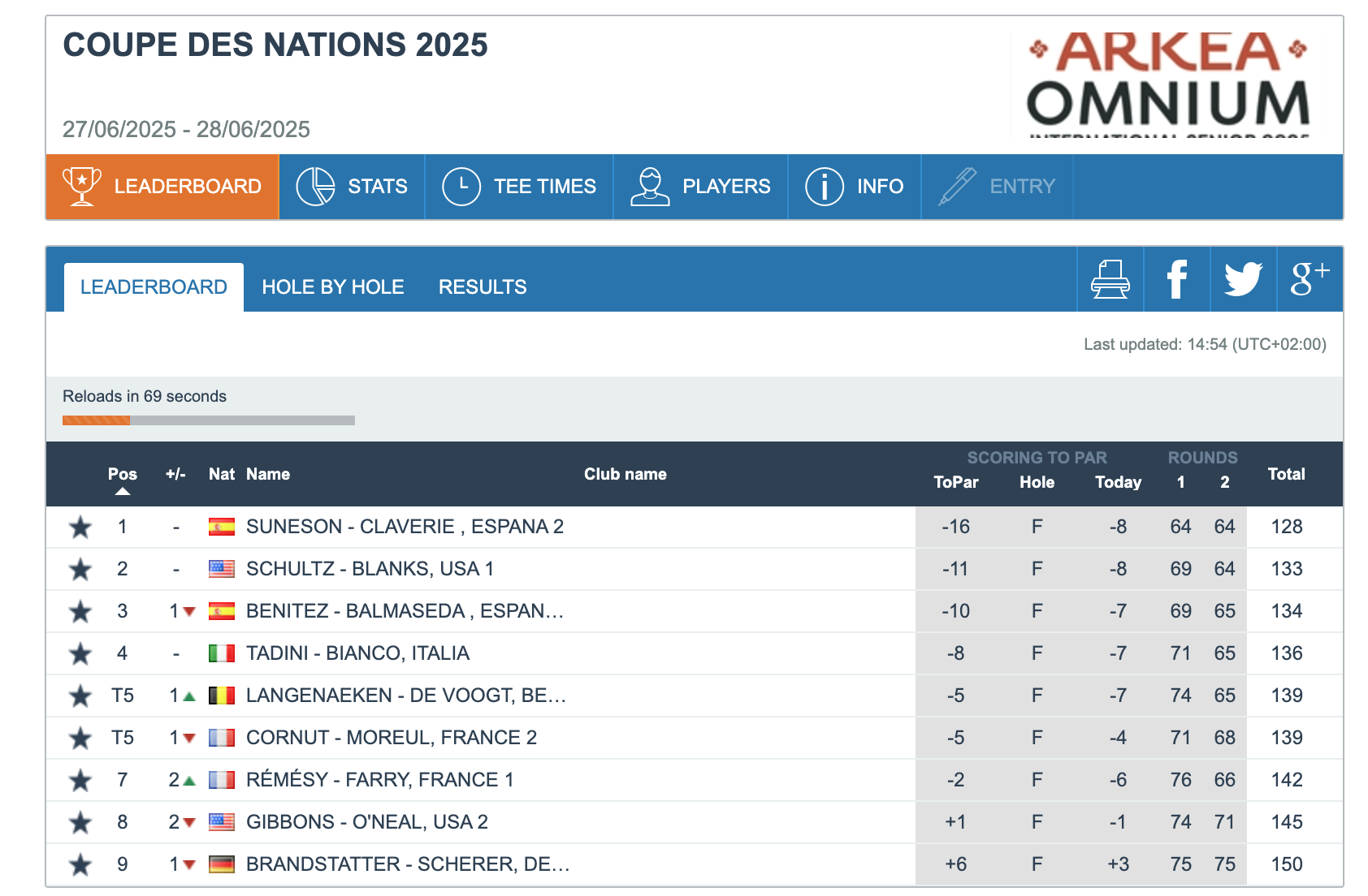La Coupe des Nations est disputée dans le cadre de l'ARKEA OMNIUM, c’est un challenge international opposant les associations de golfeurs professionnels de différents pays et continents. Les équipes des nationalités suivantes ont participé à la coupe des nations : Espagne/ Italie/ Allemagne / Angleterre/ Etats-Unis/ France.